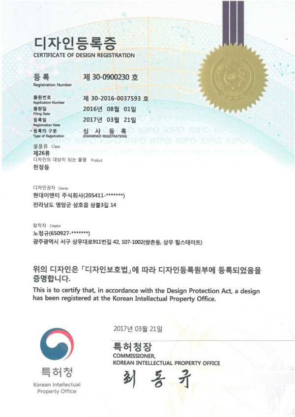 디자인 등록증 사각2 천장등 디자인등록