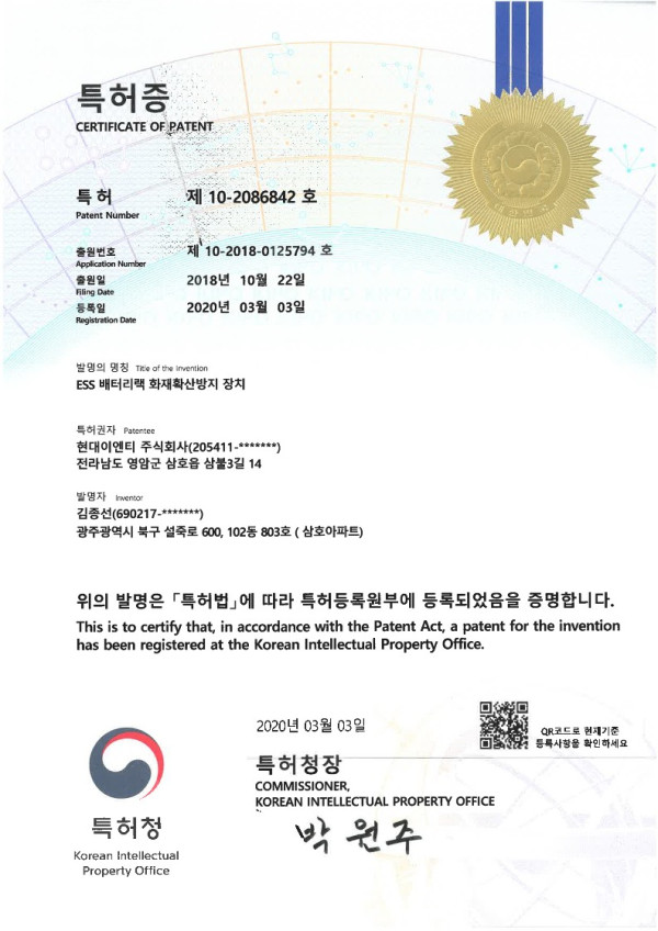 ESS 배터리랙 화재확산방지 장치 특허 > 산업재산권현황